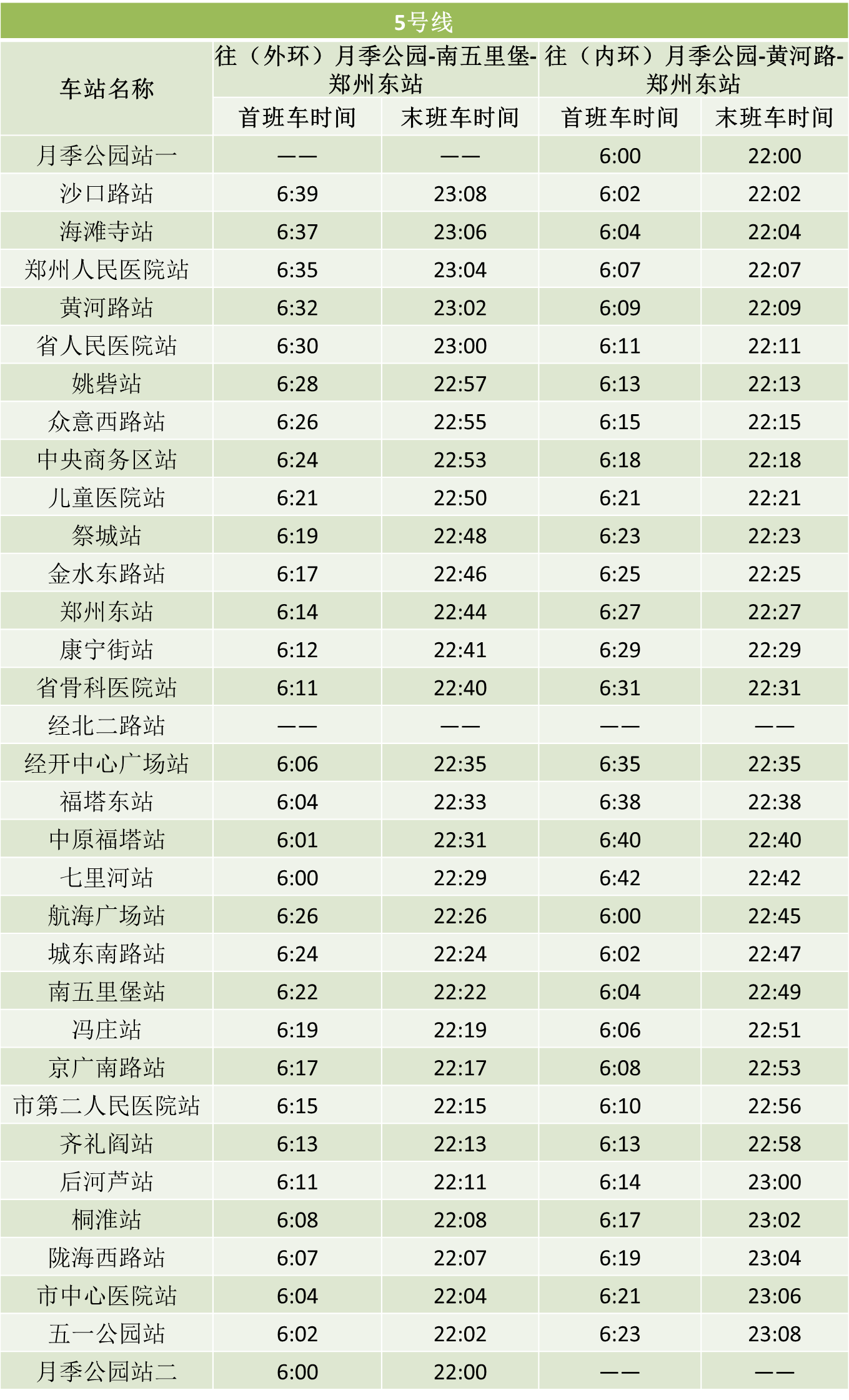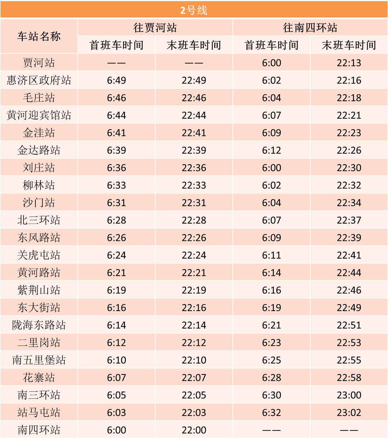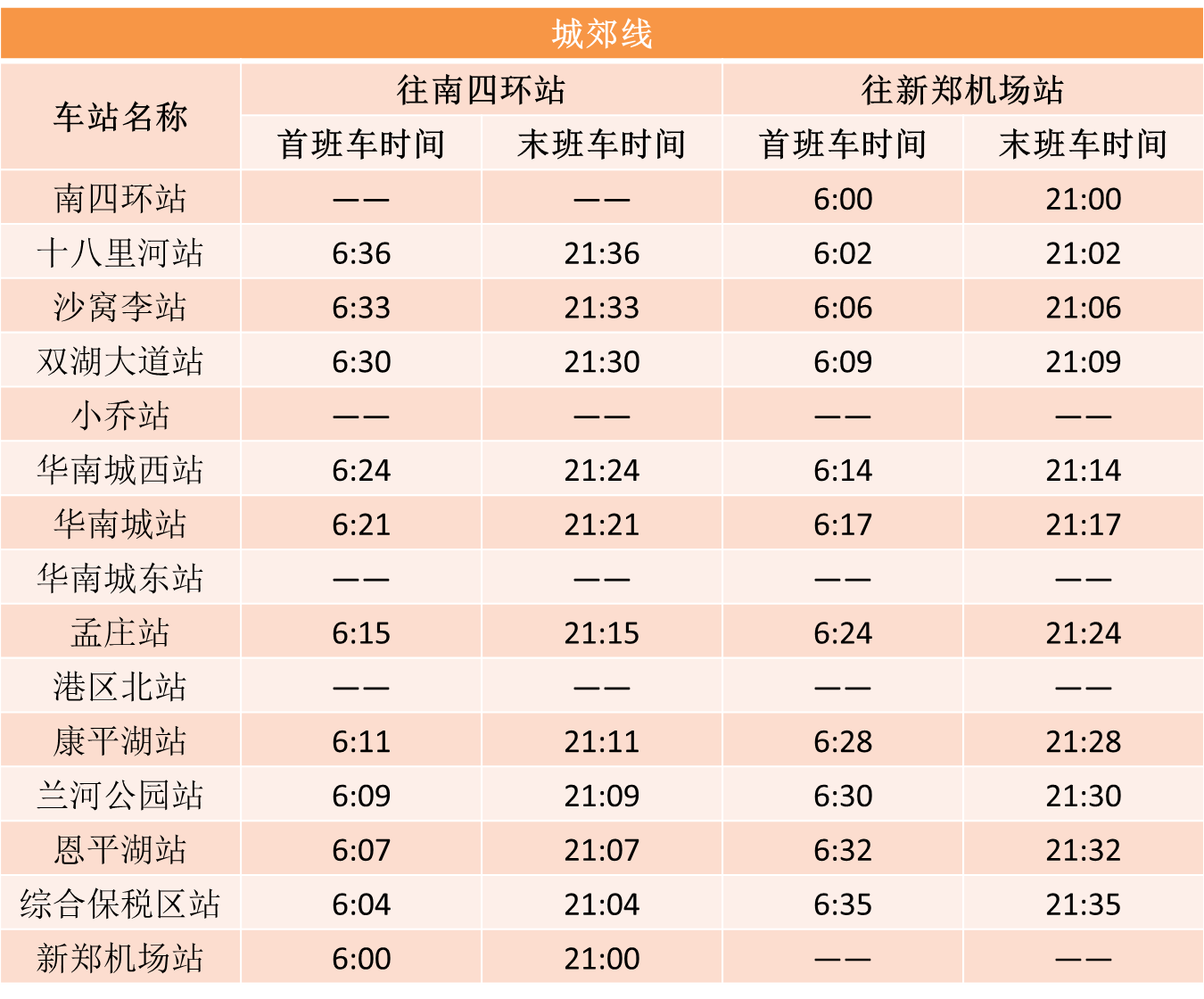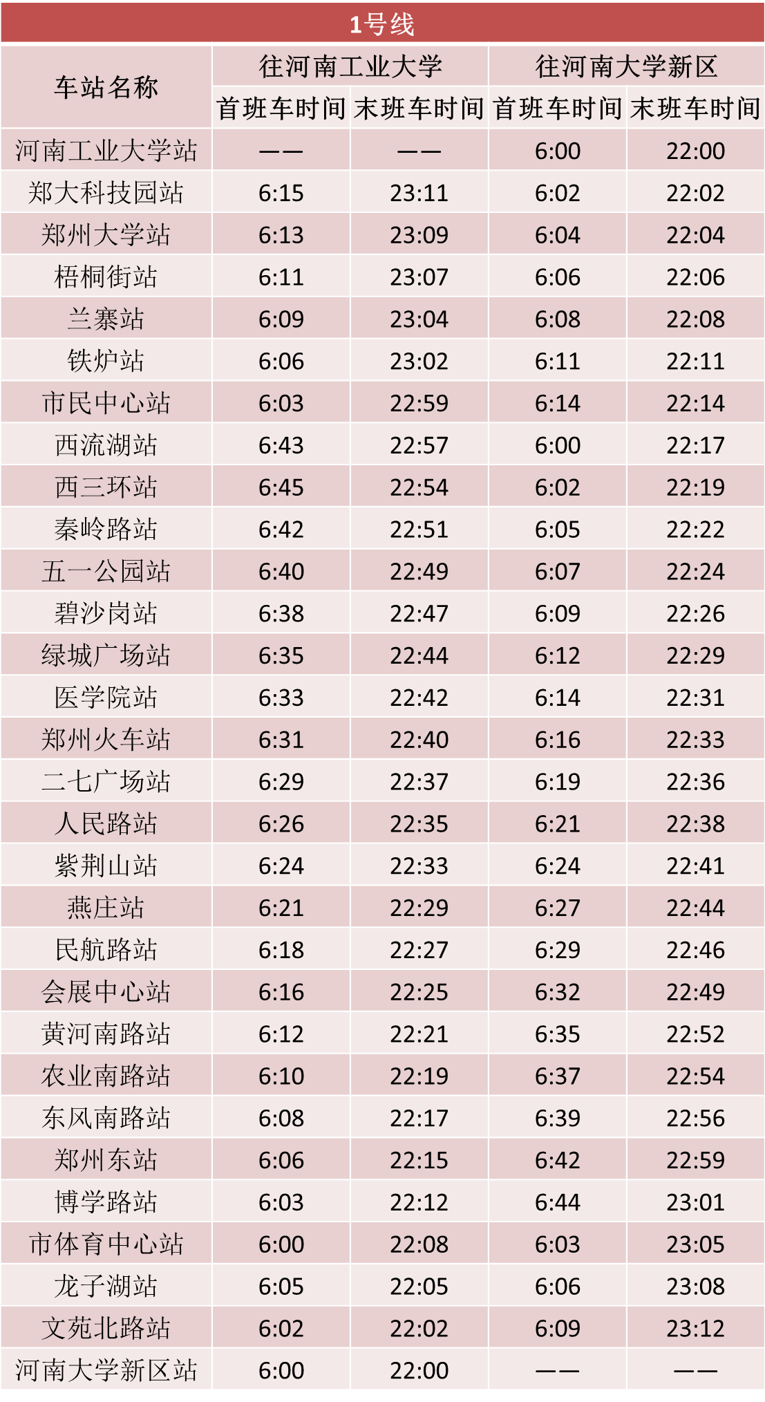 郑州市发布最新通告,自2020年3月9日零时起,恢复机动车限行。结合复工复产后逐步回升的客流情况,在严格做好疫情防控工作前提下,h漫 自3月9日起将调整全线网行车间隔。1号线、2号线、5号线行车间隔压缩至高峰期8分钟以内,城郊线行车间隔压缩至高峰期16分钟以内,14号线一期暂不恢复运营。线网已开通车站首末班车时刻表如下: